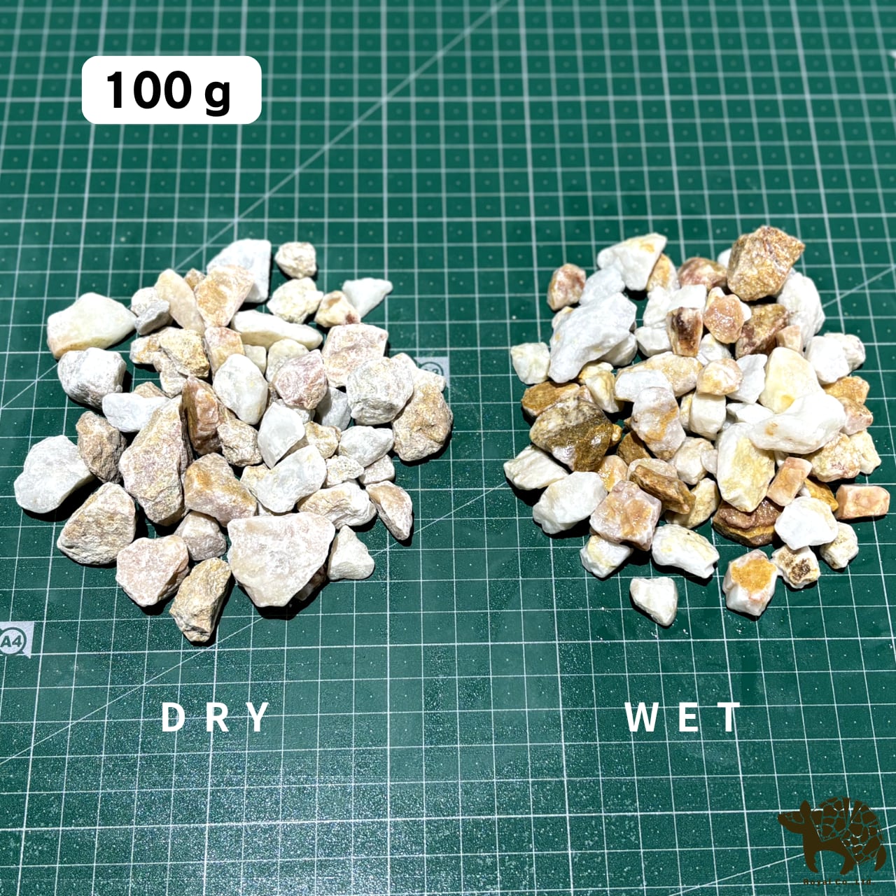 When dry, it presents a bright white-yellow tone as seen in the photo, while its color deepens when wet. As shown in the wet photo, the gravel is composed of mixed stones with various color variations. However, it maintains an overall yellow appearance, creating a bright, eye-catching effect that makes it a standout gravel. It possesses brightness, a yellowish atmosphere, and a distinct presence in each individual grain.