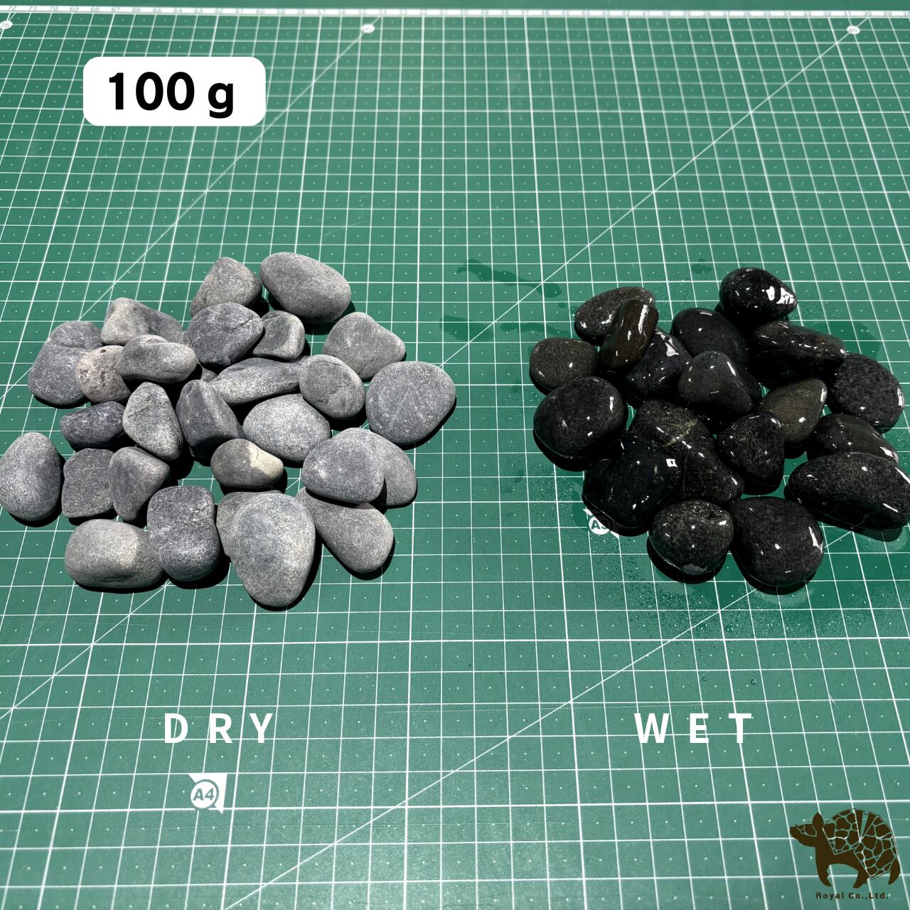 As shown in the photo, compared to other black gravels (such as Kurokōseki or Kuro Ryūseki), its dry state (when not wet) appears less black and less glossy. However, as a natural gravel, it has a natural appearance and turns a deep black color when wet, as seen in the photo. Its appearance changes significantly between dry and wet states. This gravel is recommended for those seeking a black gravel that is not jet black and lacks gloss.