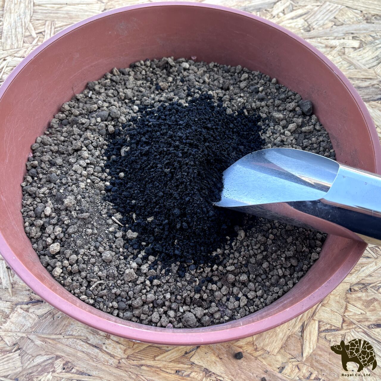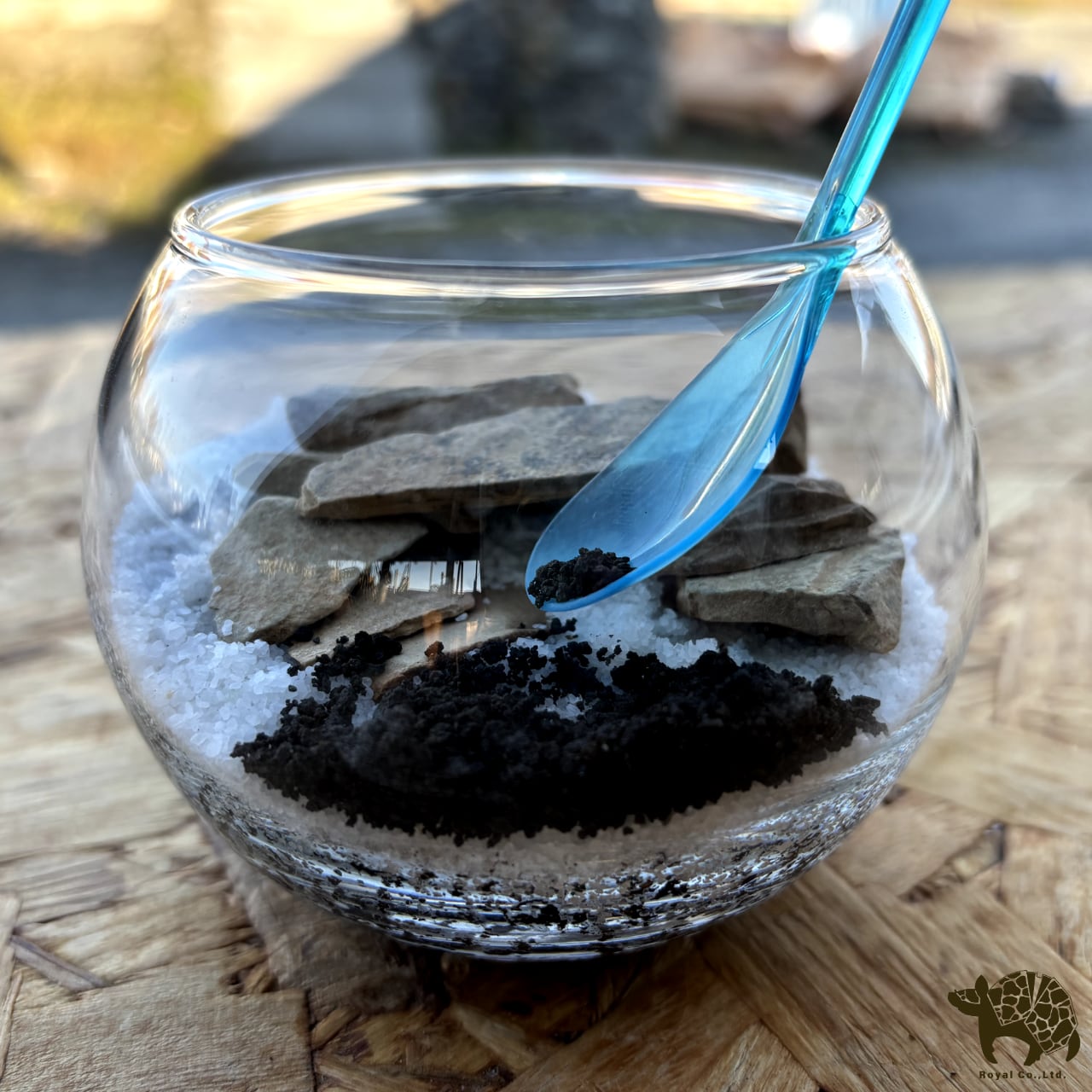 引き締まるような黒色と比較的均一な粒が化粧砂として優秀です。また、溶岩の多孔質性から通気性、排水性に優れており機能面でも使い勝手のいい砂です。