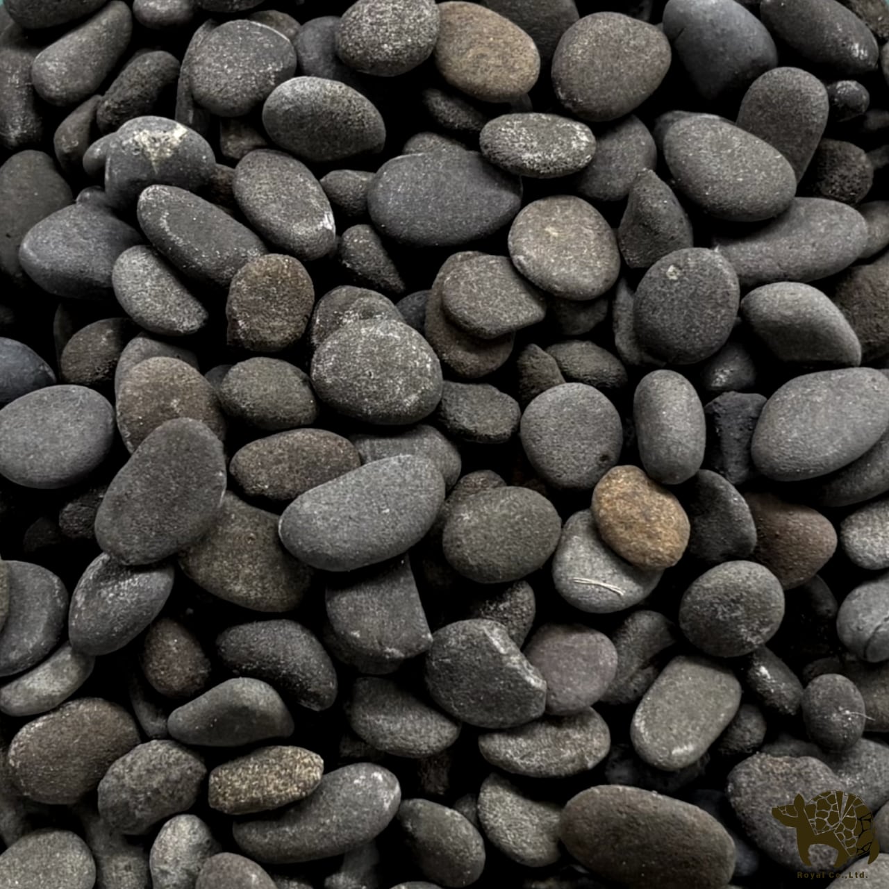This is dark-colored gravel with a natural stone hue. It resembles small, flattened river stones.
