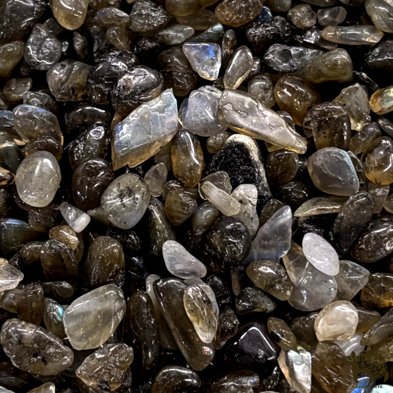 Black and brown tones form the base color, with the characteristic blue, green, yellow, red, and gold hues of labradorite appearing on the surface depending on the angle. The polished fragments are rounded with no sharp edges.